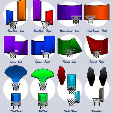 Players of all ages and abilities proceed through a course of angled, curved and non-conventionally configured brightly colored backboards, banking shots off the Bankboards™ and through the rims.