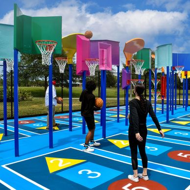 Colored shapes mark the shooting spots at each station. You try two shots from each position to make a basket. If the first try is successful, move on to the next shooting position. Bankshot Playcourts are a welcoming space that promote social interaction, imagination, and fun for people of all abilities.